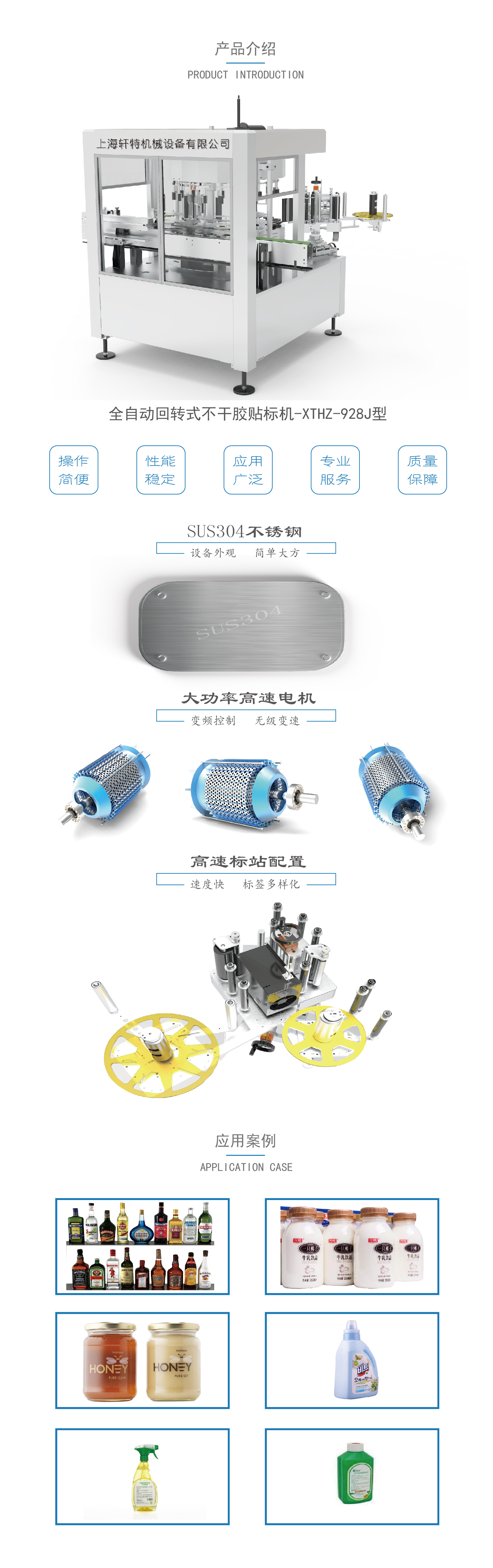 本機(jī)型適應(yīng)于:圓形瓶子多標(biāo)簽定位高速自動(dòng)貼標(biāo),方瓶一周高速自動(dòng)貼標(biāo),以及其他復(fù)雜瓶型高精度的自動(dòng)貼標(biāo)要求